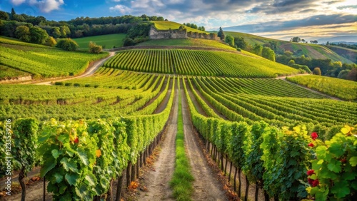 © Praphunsak, Fototapeta premium Overlooking vineyard with rows of grapevines stretching up a hillside, wine, France