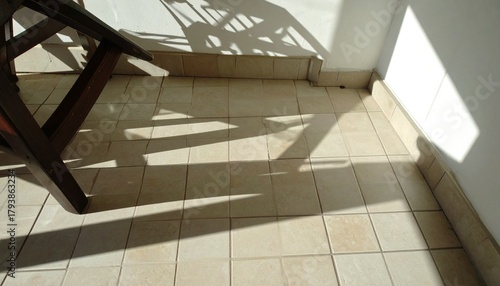 Fototapeta premium Overturned Chair on Sunlit Tile Floor in Closed Dining Area