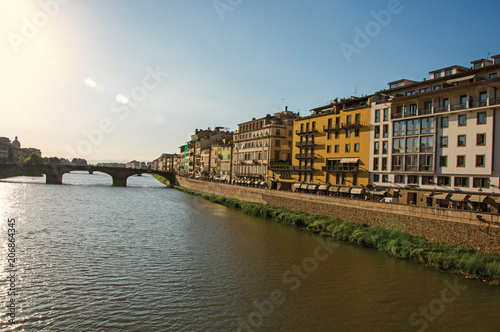 Fototapeta premium Overview of the river Arno, bridge and buildings at sunset. In the city of Florence, the famous and amazing capital of the Italian Renaissance. Located in the Tuscany region