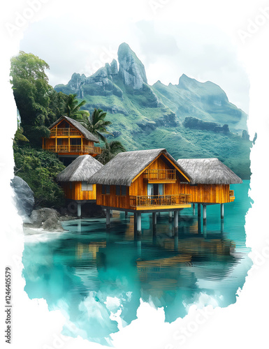 © Denniro, Naklejka premium Overwater bungalows with lush mountains in the background. Tropical stilted huts over turquoise water, surrounded by greenery and dramatic peaks