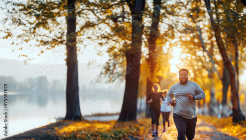 © Rymden, Fototapeta premium Overweight man going for a run with friends
