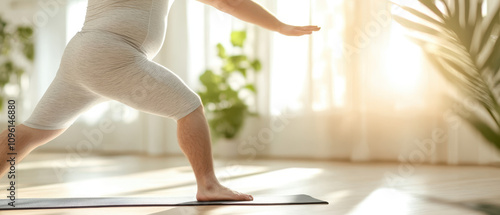 © praewpailyn, Fototapeta premium overweight man performing stretches on yoga mat in bright room filled with plants, showcasing focus on fitness and well being