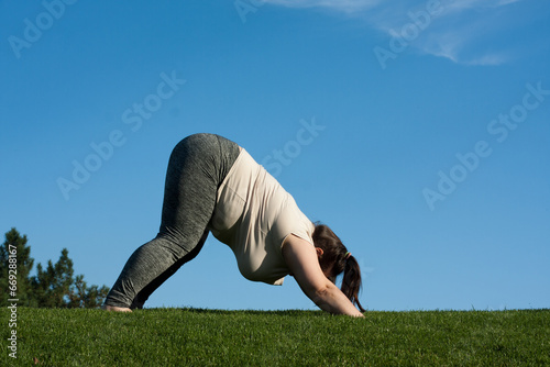 © lilu2005, Fototapeta premium overweight middle-aged woman practices yoga in park, blue sky background. fat woman doing Downward facing dog exercise, adho mukha svanasana pose. Healthy lifestyle, Pilates outdoors in summer