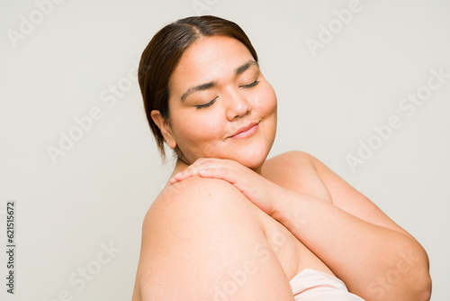 Obraz premium Overweight woman in her 30s using body care beauty products