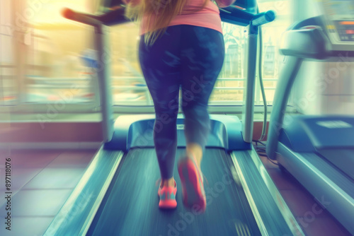 © Poramet, Fototapeta premium Overweight woman runs on treadmill in gym, motion blur effect