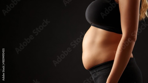 © Igor, Fototapeta premium Overweight Woman Showing Belly Side View Isolated on Black