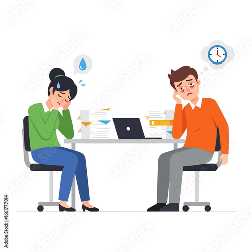 Fototapeta premium Overwhelmed and Drained: Two office workers struggle under the weight of...