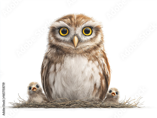 © daejang, Fototapeta premium owl, bird, animal, wildlife, nature, bird's nest, nest, wild, predator, beak, brown, prey, eyes, family, feathers, feather, portrait, little owl, raptor, hunter, eye, eagle, white, wise, bird of prey,