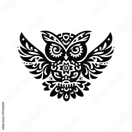 © Cici, Fototapeta premium Owl bird in folk art black and white silhouette illustration