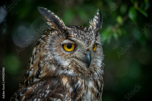 © Nashrin, Fototapeta premium Owl eye at night, glowing in darkness, intricate feathers, mystical forest ambiance
