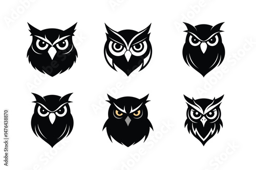© Madhusudan, Fototapeta premium Owl head silhouette Vector bundle illustration, Set of Owl head silhouette