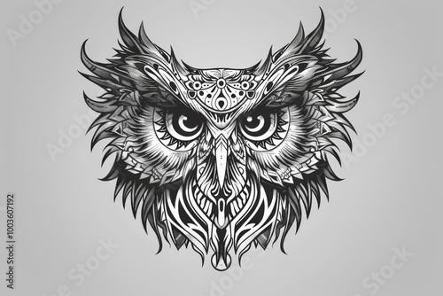 © Cloudyew, Obraz premium Owl head with intricate tribal patterns.