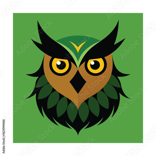 © sk, Fototapeta premium Owl Head with Leaf Feather Elements Logo