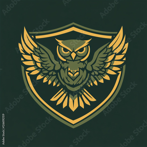 © Khelga Volkova, Obraz premium Owl illustration with wings on dark shield background