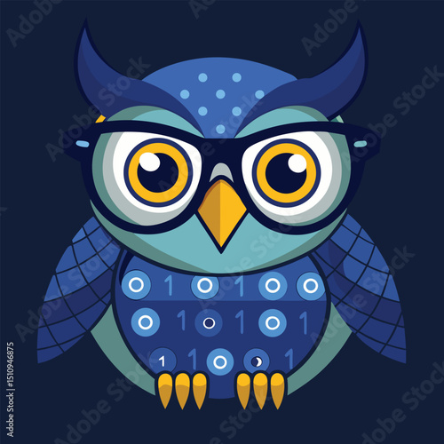 Fototapeta premium Owl mascot design featuring a binary code pattern on the feathers, highlighted by large glasses and bright colors, representing technology and education