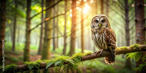 Obraz premium Owl perched on a tree branch in a peaceful forest setting , owl, wildlife,...