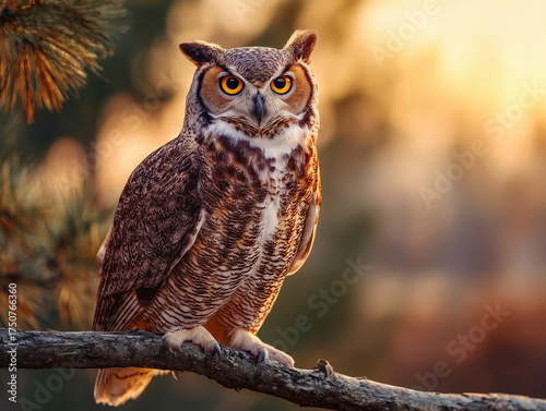 © Baqibillah, Fototapeta premium Owl perched on branch in golden sunset light