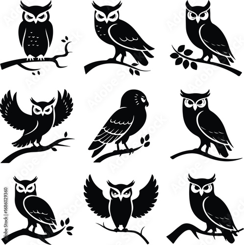 Obraz premium Owl Perched on Branch Silhouette Icon Vector Set Forest Owl Sitting on Tree...