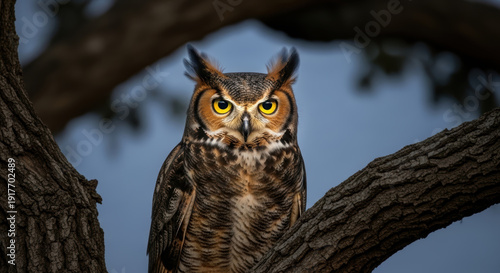 © Mikus, Fototapeta premium Owl perched on tree branch at dusk
