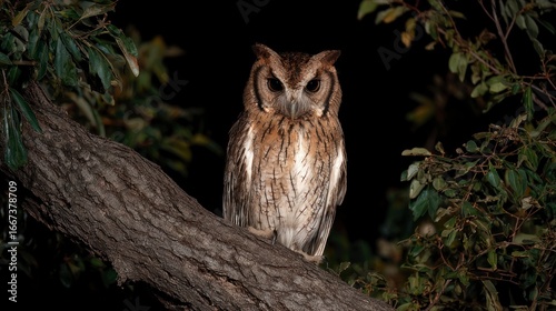 © affandy, Obraz premium Owl perched on tree trunk at night