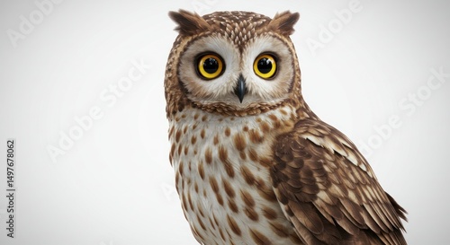 © Pawon.STD, Naklejka premium Owl portrait on white background with brown and white feathers looking forward.