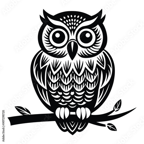 Fototapeta premium Owl Silhouette on Branch, Owl sitting on a tree branch vector silhouette, Outline of Perched Owl Silhouette