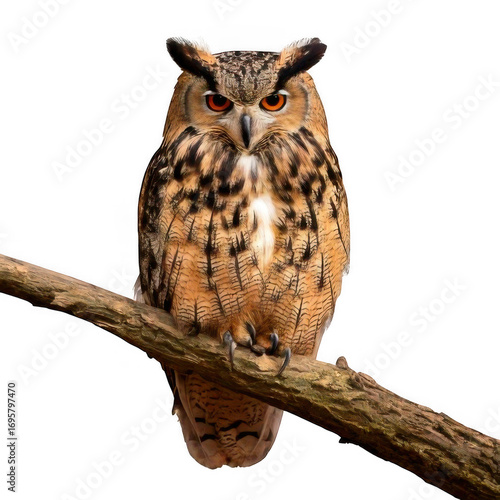 © MSTRAJIA, Obraz premium Owl sitting on branch, isolated on white and transparent background