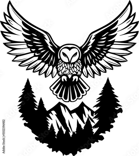 Obraz premium Owl tattoo design in SVG format. Black and White Owl with Mountain and Tree Design