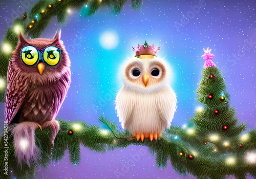 © Agnieszka, Fototapeta premium owl with crown on christmas tree