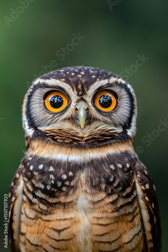 © Pui, Fototapeta premium Owl with wide eyes, A striking close-up of an owl with vivid orange eyes, showcasing its intricate feathers and curious expression.