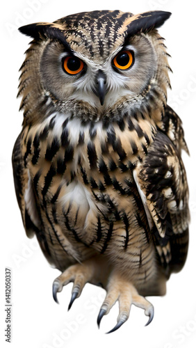 © Illustra, Fototapeta premium Owl with wings partially open, looking straight ahead, isolated on white