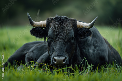 © Nadezda Ledyaeva, Naklejka premium Ox lying on the green grass