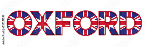© ink drop, Obraz premium Oxford city word made from union jack flag lettering. 3D Rendering