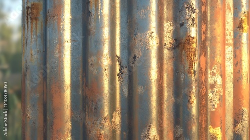 © roni, Fototapeta premium Oxidized corrugated surface in abstract pattern, light on weathered metal