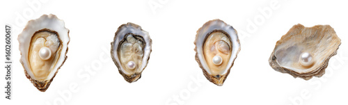 Naklejka premium Oysters with pearls displayed in shells. Luxury, jewelry, treasure, wealth, food, gourmet, seafood, delicacy, rare, precious, value, beauty, nature, elegance.