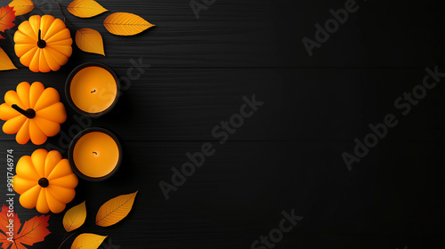 Fototapeta premium ozy autumn arrangement with orange candles, pumpkin, and colorful fall leaves on dark background perfect for Thanksgiving, Halloween, or seasonal greeting card designs