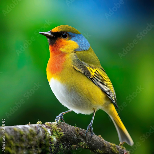 Obraz premium Pájaro blanco amarillo naranja gris y azul posado en una rama con musgo con un fondo verde