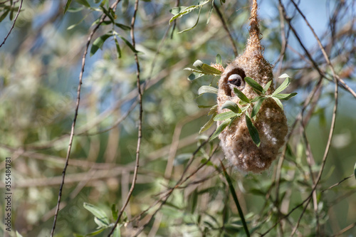 © LFRabanedo, Fototapeta premium Pájaro moscón europeo, en el interior de su nido en construcción. Remiz pendulinus.