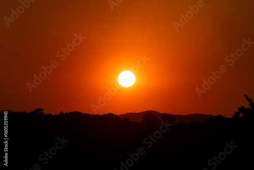 Fototapeta premium Pôr do sol intenso com céu em tons de vermelho e laranja sobre silhuetas de...