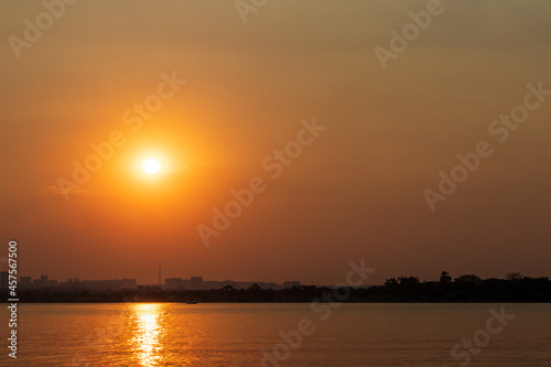 © Raulzito Moura, Naklejka premium Pôr do sol sobre a cidade e o lago em Brasília, Brasil.