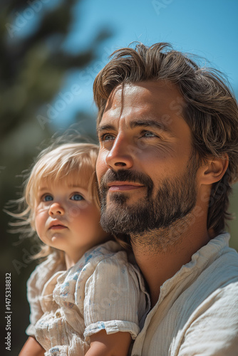Fototapeta premium Père et enfant profitant d’une promenade au soleil près de la mer, ambiance...