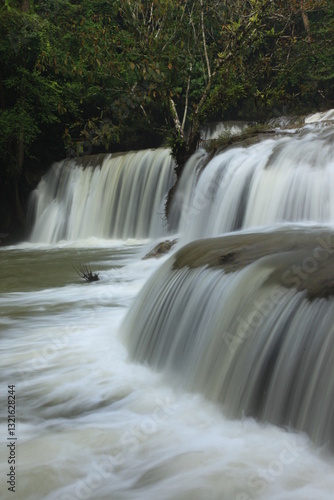Fototapeta premium Pa La Tha Waterfall is a beautiful limestone waterfall. Its highlight is the waterfall's long width, clearly descending into 3 levels. It is most beautiful during the rainy season. Umphang ,THAILAND