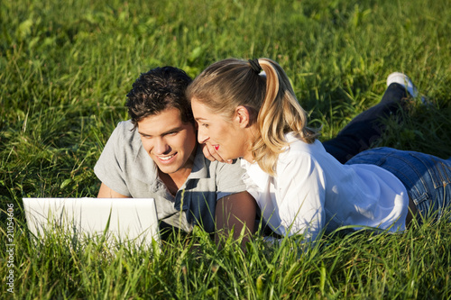© Kzenon, Fototapeta premium Paar auf Wiese mit WLAN im Internet