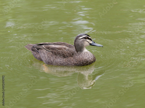 Obraz premium Pacific Black Duck (Anas superciliosa) swimming alone in a pond.