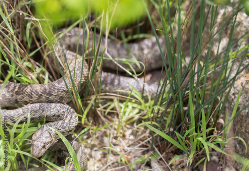 Fototapeta premium Pacific Gopher Snake (Pituophis catenifer catenifer) looking with cautious. Santa Cruz, California, USA.