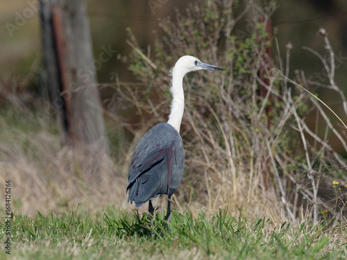 © Alan, Naklejka premium Pacific Heron or White-necked Heron (Ardea pacifica)foraging for food in the grass of a paddock.