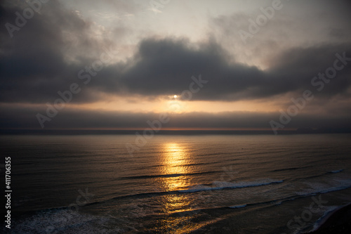 © artrolopzimages, Naklejka premium Pacific Ocean in Lima, Peru. Sunset in Peru. Green Coast.