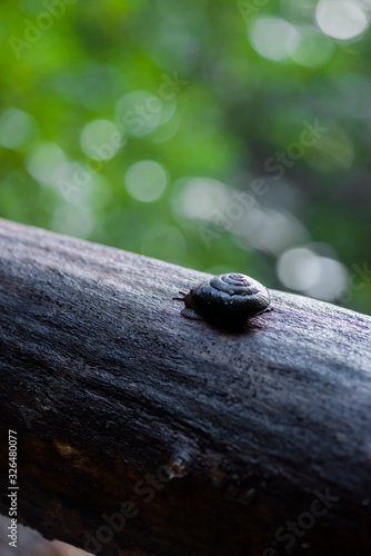 Obraz premium Pacific sideband snail in redwood forest climbing on falling log, large snail