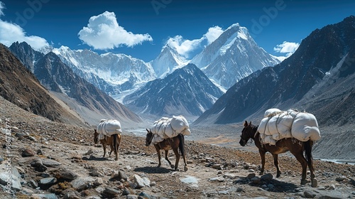 © BG_Illustrations, Naklejka premium Pack horses traversing rocky trails in the Karakoram mountains
