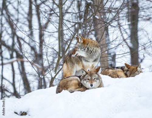 Naklejka premium Pack of coyotes resting in mid winter in a boreal forest Quebec, Canada.